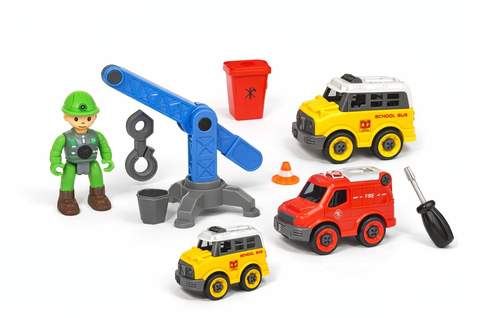 The set includes a selection of bright, chunky vehicles and accessories such as a school bus, fire truck, crane, traffic cone, bin, tools, and a construction worker figure. Using the included screwdriver, children can take the vehicles apart and put them back together, encouraging problem-solving, coordination, and independent play.