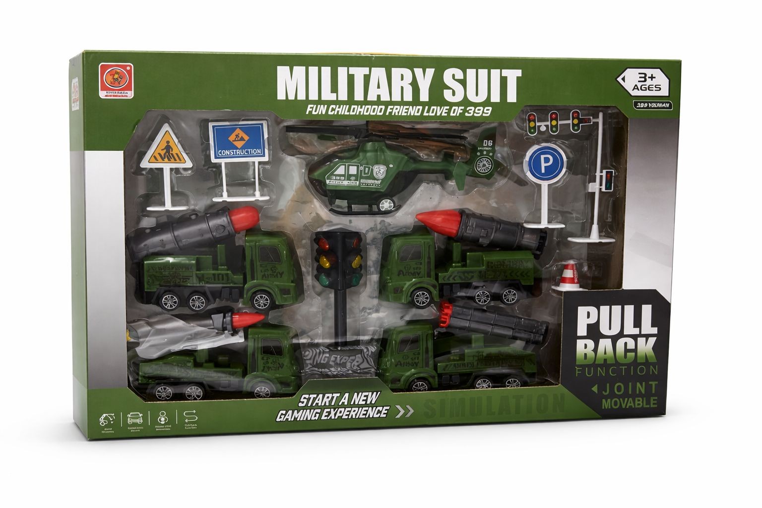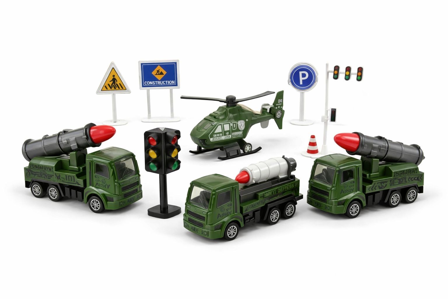 The set features a variety of ground vehicles and a helicopter, each styled in classic military green with realistic details. The pull-back function on the vehicles allows kids to simply pull them back and release for forward motion, adding dynamic movement and interactive fun. Movable joints and parts enhance realism and engagement during play.